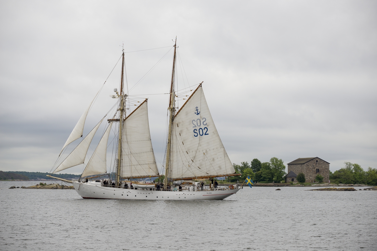 Den för specialinbjudna invigningsdagen av ubåtshallen tillhörande Marinmuseum. Skeppet FALKEN seglar vid sidan av Marinmuseum.