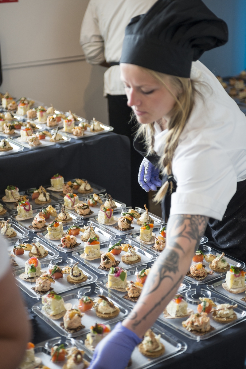 Den för specialinbjudna invigningsdagen av ubåtshallen tillhörande Marinmuseum. Restaurang Skeppsgossens personal serverar mat.