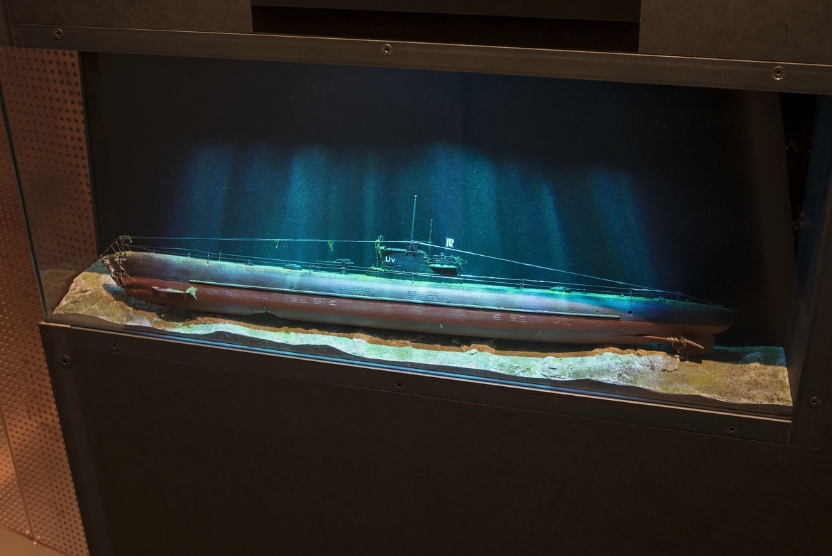 Den sjunkna ubåten ULVEN illustrerad som modell inne i Marinmuseums ubåtshall.