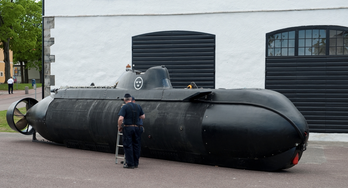 Miniubåten HMS Spiggen ligger tillfälligt framför slup & barkassskjulet utanför Marinmuseum.