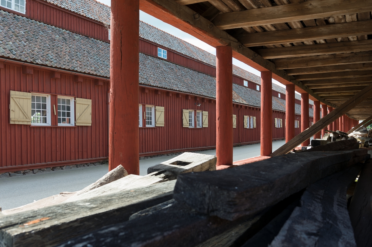 Fotodokumentation av byggnader på Lindholmen i Karlskrona. I bakgrunden: Repslagarebanan, byggdes under 1692-1693, andra uppgifter anger 1696 som tillblivelseår. Det första banhuvudet tillkom senare, år 1697. I förgrunden: Slitaget byggdes omkring 1850 användes som ett virkesskjul. De runda träpelare ska ha varit utrangerade mastträn. Byggnaden är ca: 96 meter.