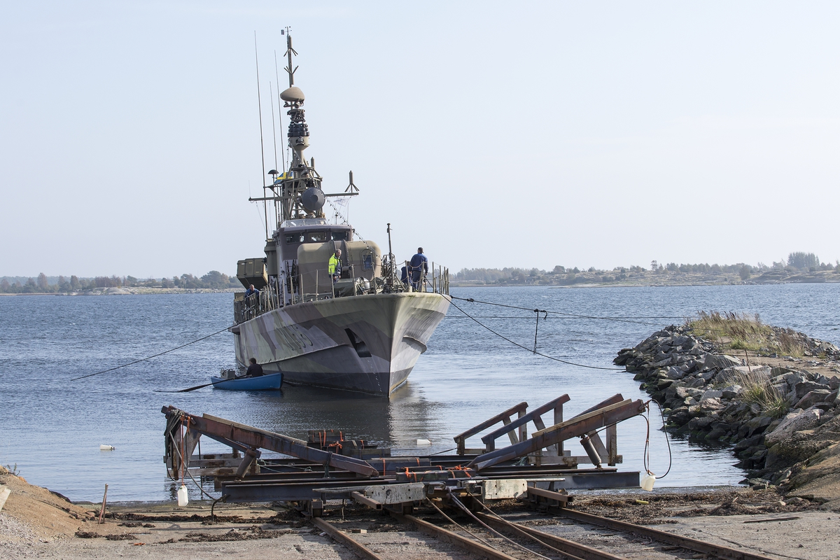 Musei robotbåten VÄSTERVIK har bogserats ifrån Marinmuseum i Karlskrona till Hasslö båtvarv för renovering/ommålning.