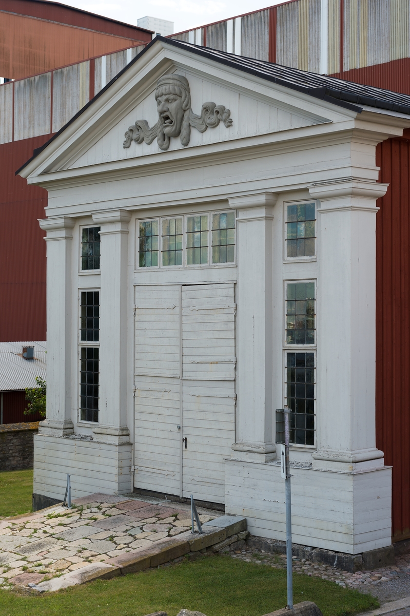 Fotodokumentation av Marinbasens byggnader. Bildhuggareverkstaden. Byggd 1782. Här arbetade amiralitetsbildhuggaren Johan Törnström med linjeskeppens galjonsbilder och sniderier. Flyttad till sin nuvarande plats, söder om Kansligatan.