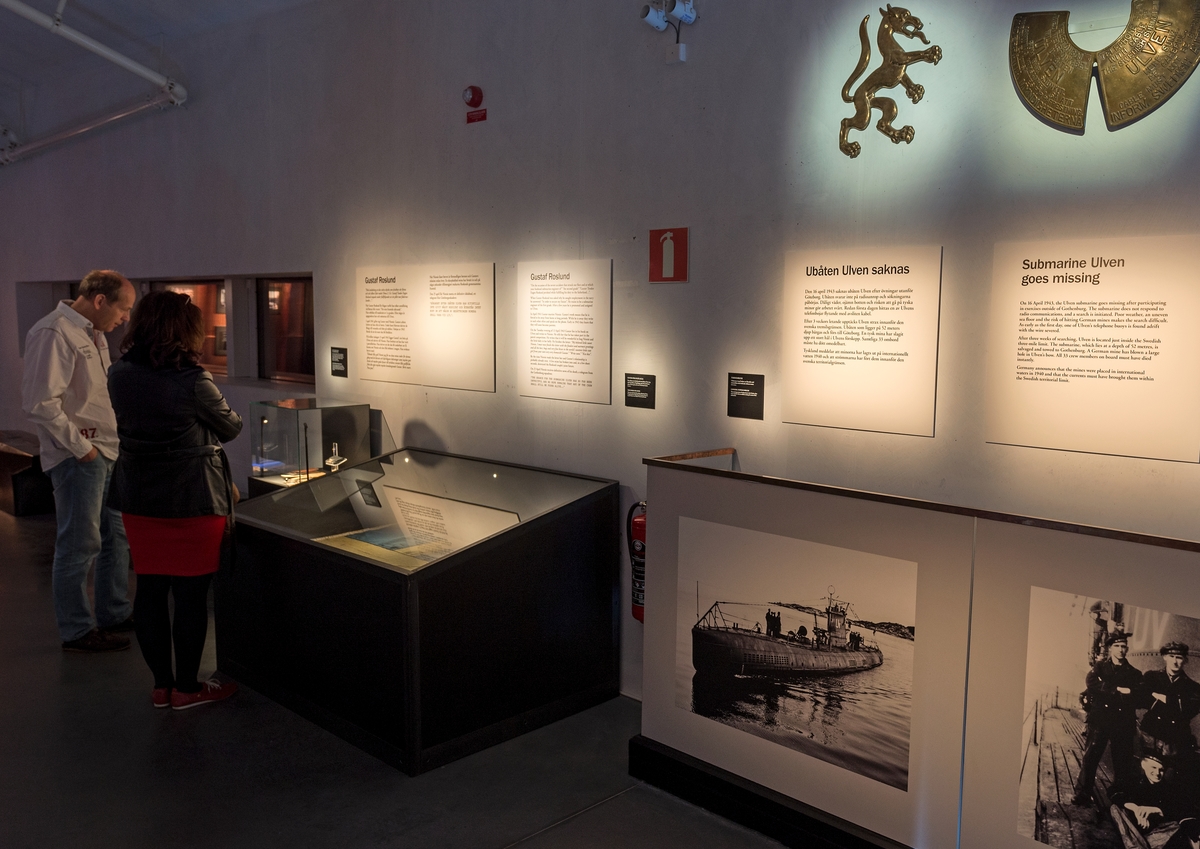 En man och en kvinna tittar på utställningen om den förolyckade ubåten ULVEN.