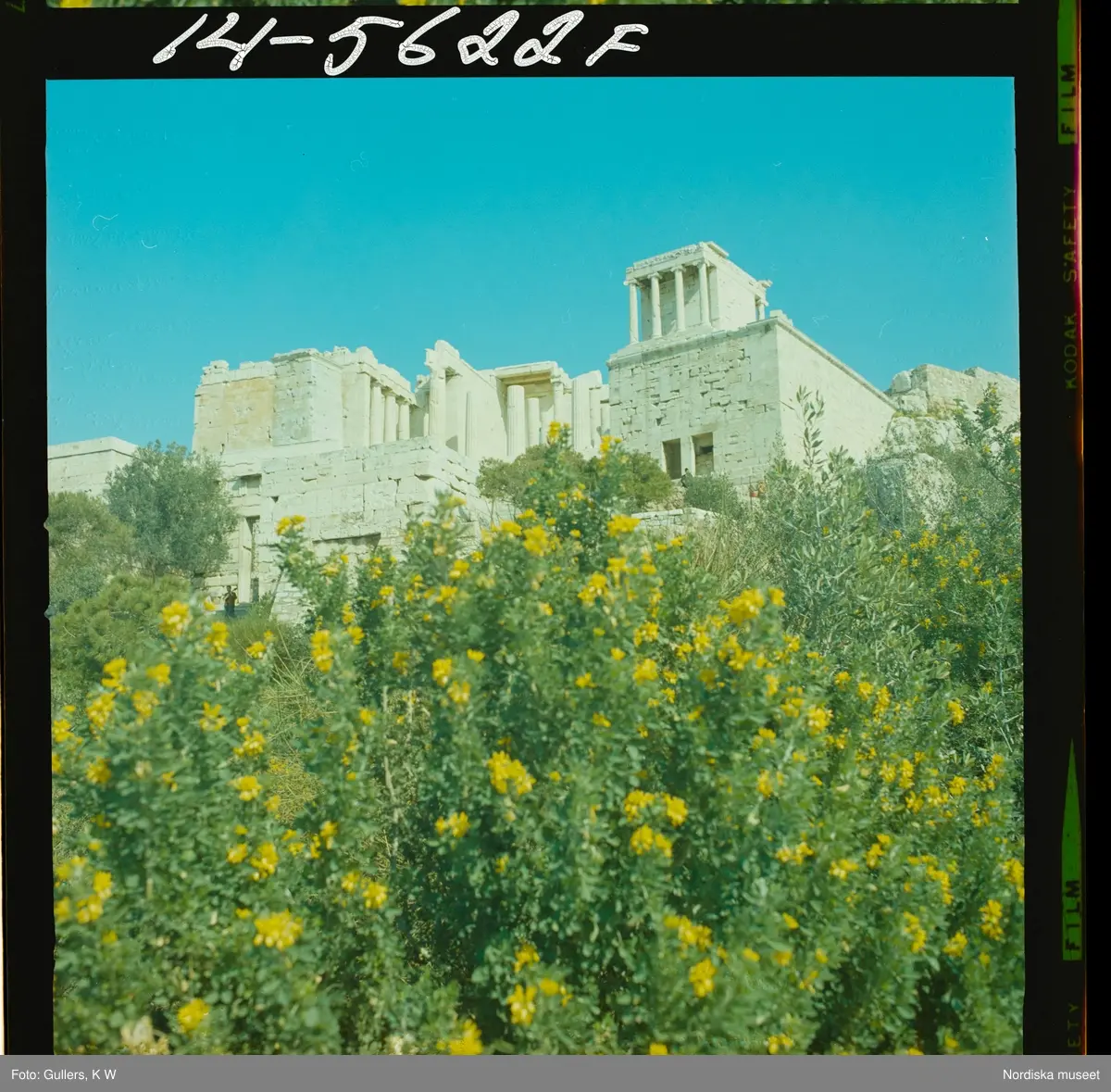 2795 Grekland Akropolisklippan med ruiner av tempel, sedd nedifrån. Blommande buskar i förgrunden.