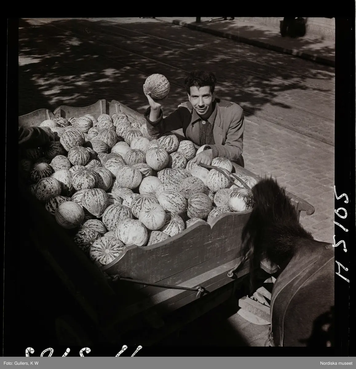 1717/L Istanbul allmänt. Gatuförsäljare. En man säljer vattenmeloner från flaket på en hästdragen vagn.