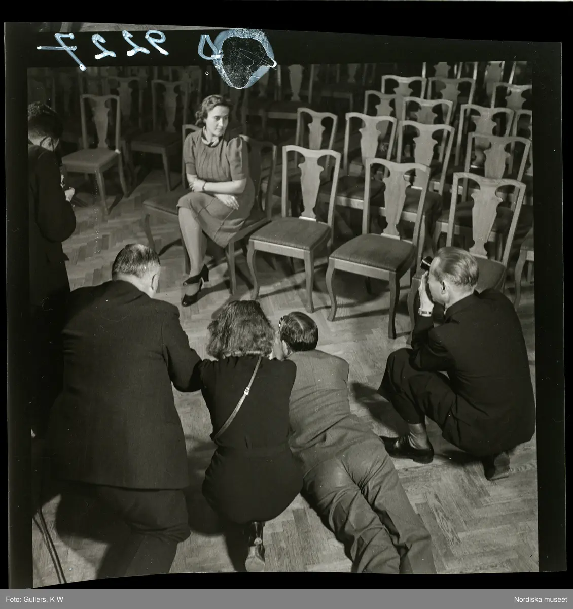 Medlemmar i fotoklubb fotograferar en kvinna som sitter på en stol i en hörsal.