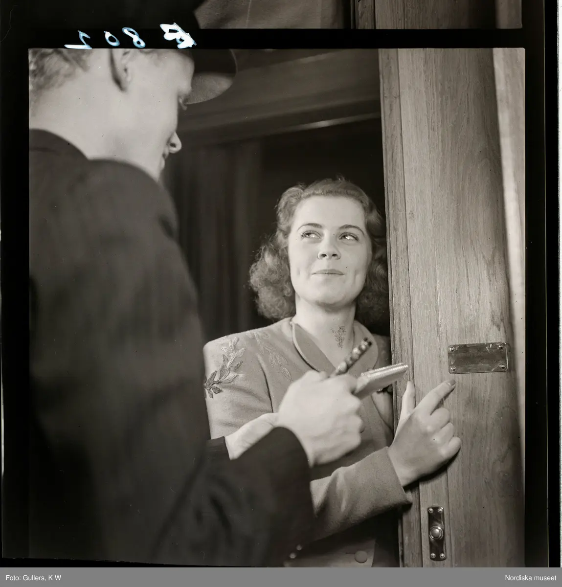 583 Sickan Carlsson för 25an Allers. Sickan Carlsson i en dörröppning, pekar på en skylt "Autografer påskrivas icke. Hänviselse Filmstaden".