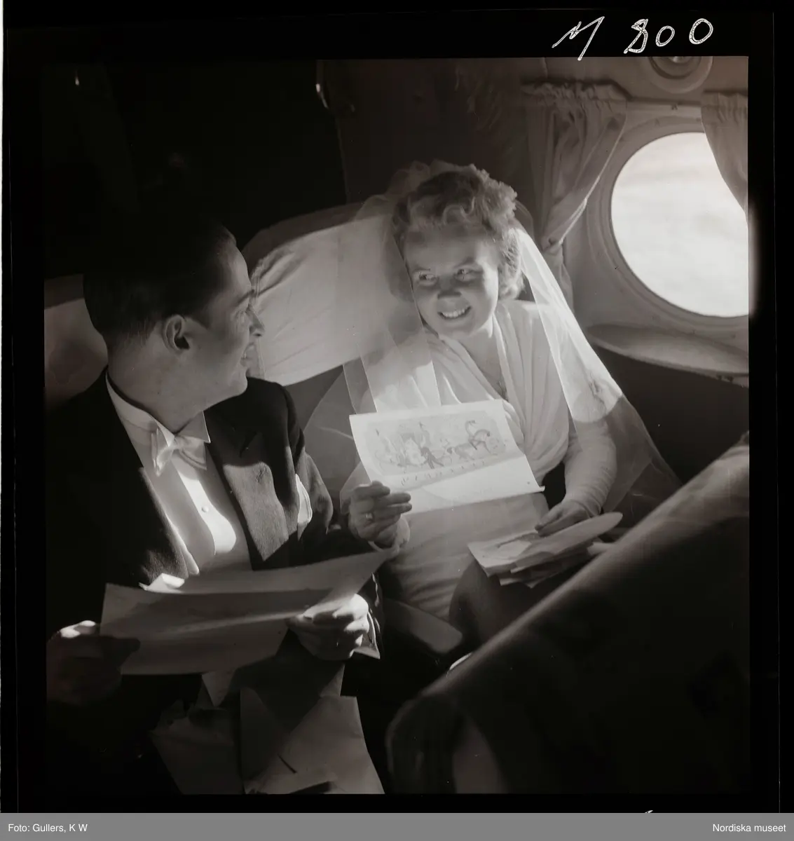 "1680 Bröllop i luften med Abas DC-4 ""Sunnan"" till Paris " Ett brudpar sitter i ett flygplan och läser telegram.