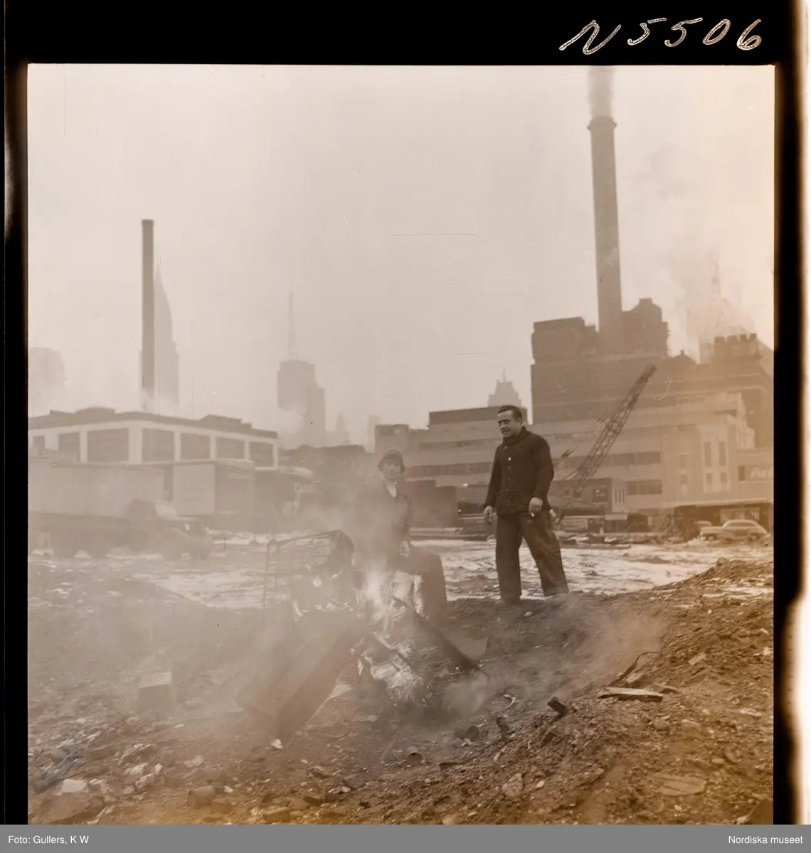 1690 New York allmänt (N.Y. Herald Tribune). Ett par män står på en rivningstomt vid en brasa av gammalt skrot.
