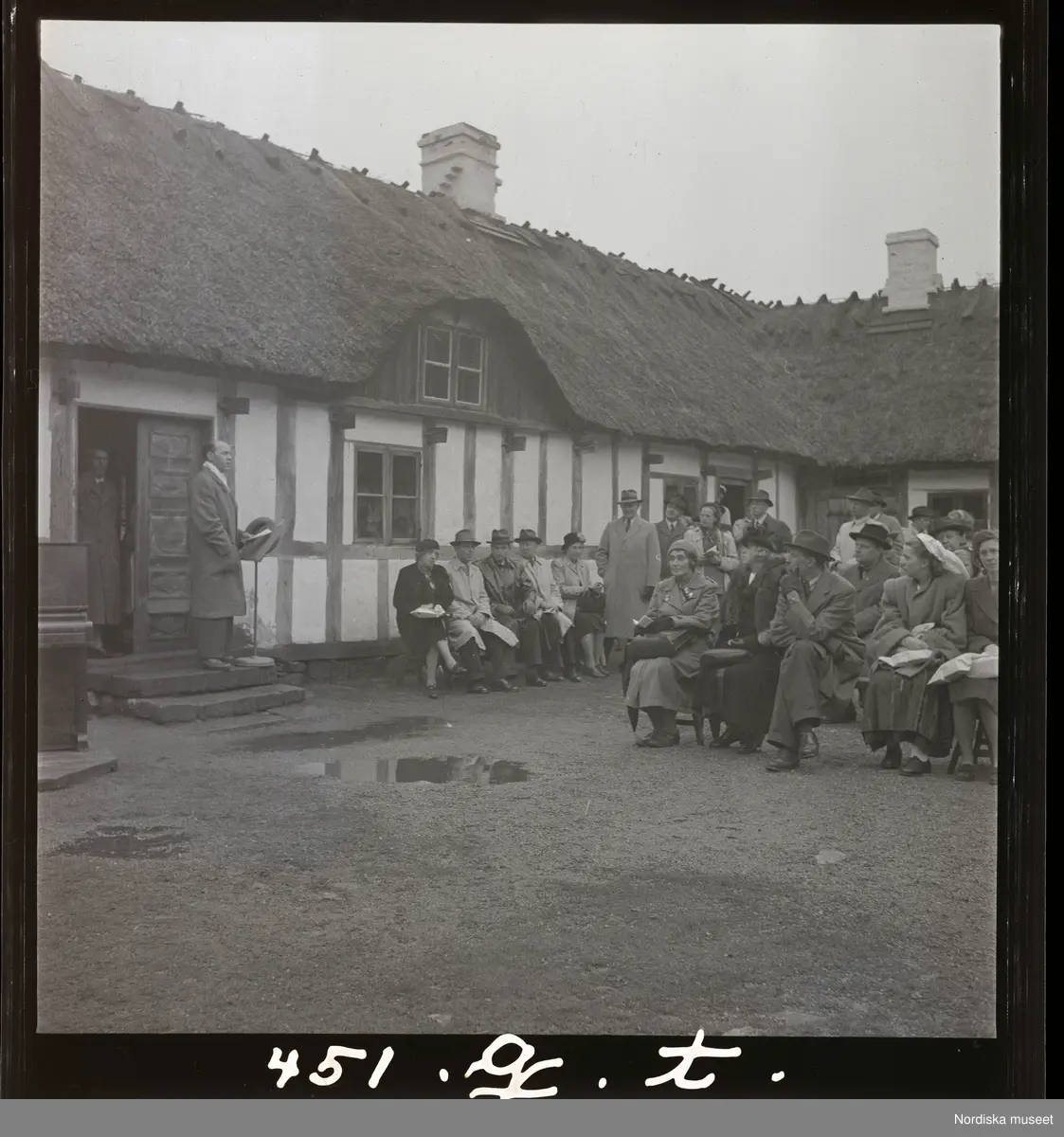 En man ståendes på trappstegen in till ett hus håller ett tal. Publik sitter framför på gårdsplanen. Skansen, Stockholm.