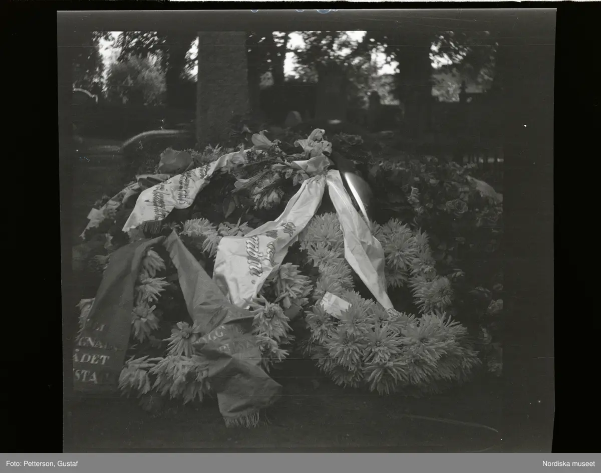 Blommor, kransar på grav. Lidingö kyrkogård.