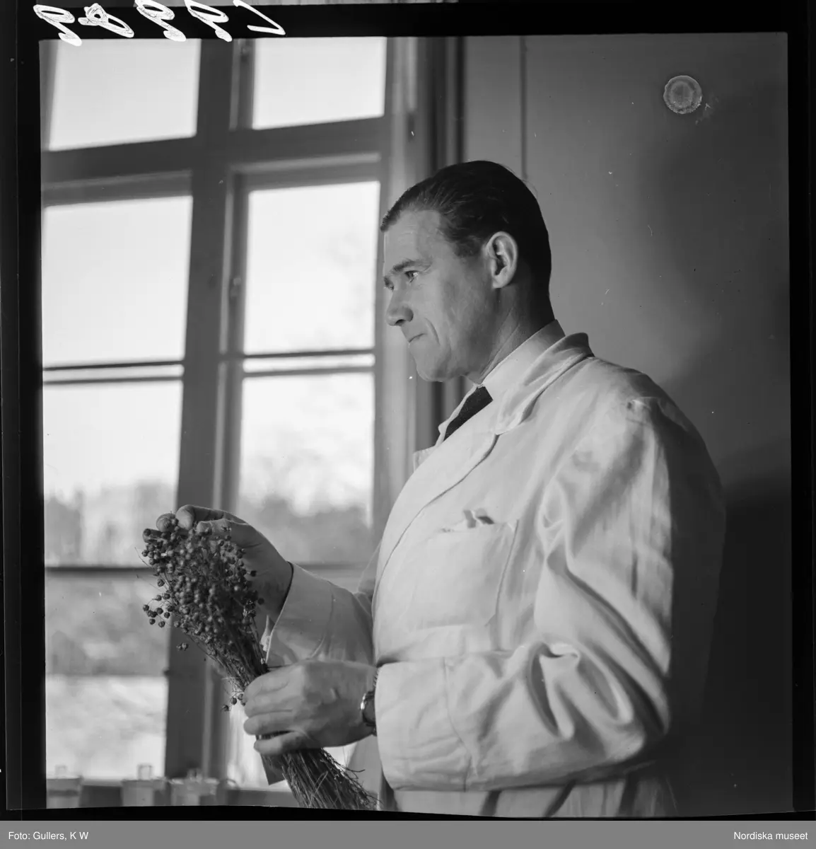 507 A Ultuna. En man i vit rock håller i ett knippe av en växt.