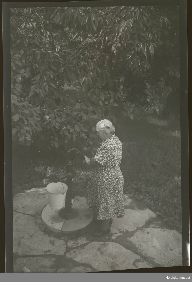 En kvinna hämtar vatten i en spann från en pump på gården.