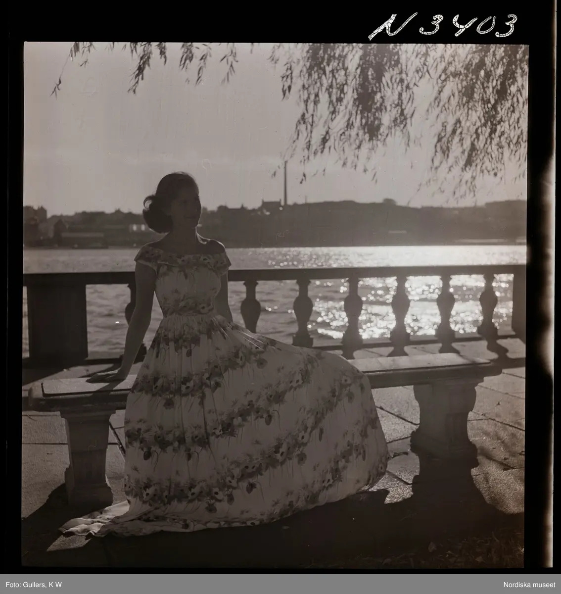 1708 N Mölnlycke väverier, mode; Stadshusträdgården, Stockholm; Mode för Mölnlycke. Modell i mönstrad klänning poserar på stenbänk framför Riddarfjärden.