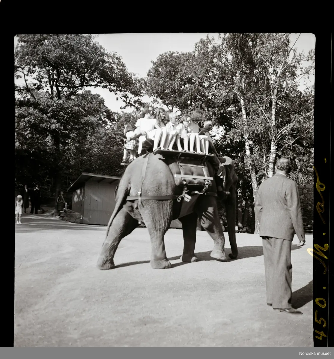 Titel: Elefanten på Skansen gör en tur med besökare på ryggen. Skansen, Stockholm.