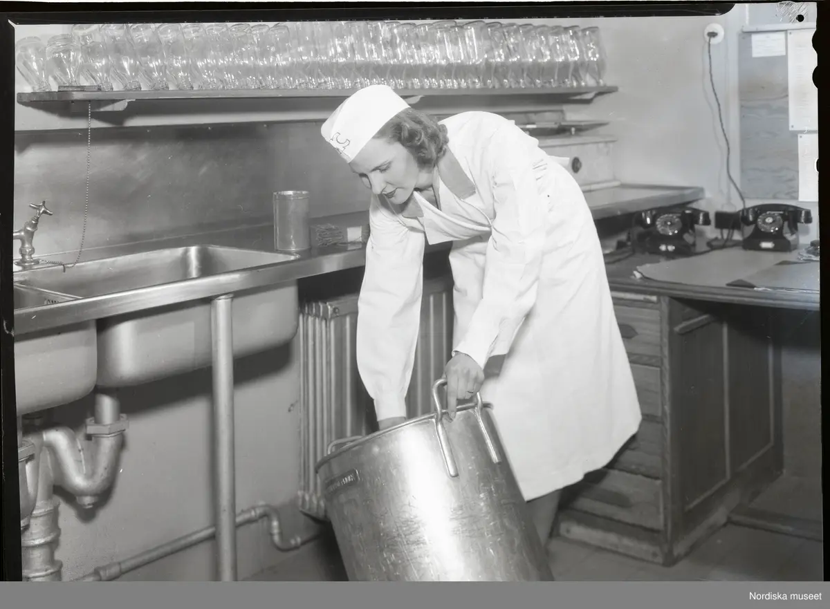 En kvinna arbetar med disk av mjölkflaskor i ett kök.
