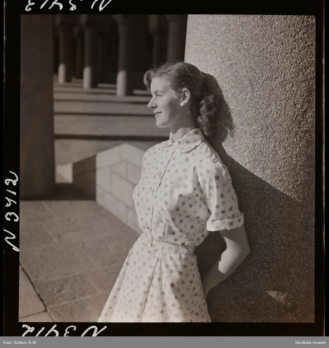 1708 N Mölnlycke väverier, mode; Stadshusträdgården, Stockholm; Mode för Mölnlycke. Modell i mönstrad klänning poserar, lutar sig mot fasad.