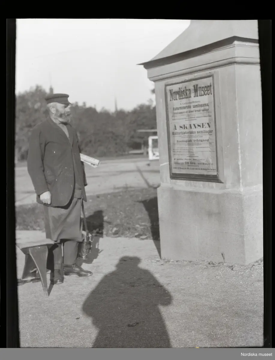 Man betraktar en affisch som gör reklam för Nordiska museet och Skansen. Djurgården, Stockholm.