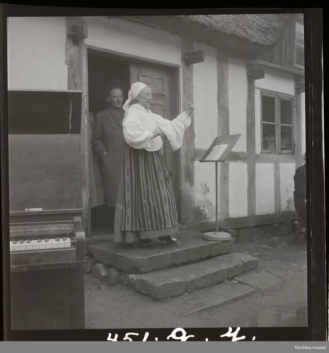 En kvinna i folkdräkt står på trappsteget in till ett hus och sjunger. Intill och ett piano. Skansen, Stockholm.
