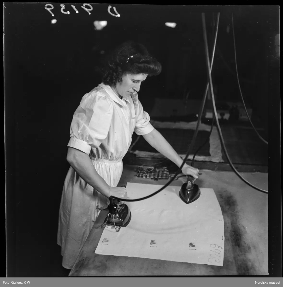 Arbete i tekoindustrin på Borås Wäfveri. En kvinnlig arbetare stryker.
