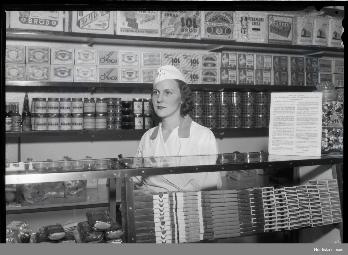 En kvinna arbetar bakom disken i en livsmedelsbutik.