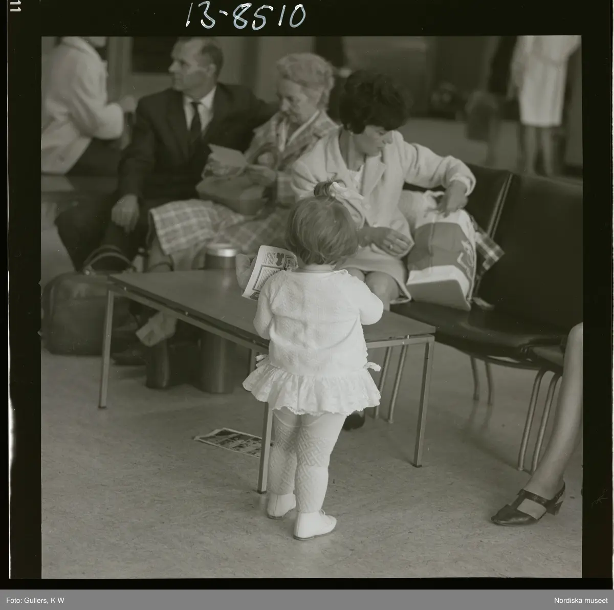 2780/2 Island Keflavik. Airport. Väntan på en flygplats. En flicka tittar i en tidning, en kvinna letar efter något i sin väska.