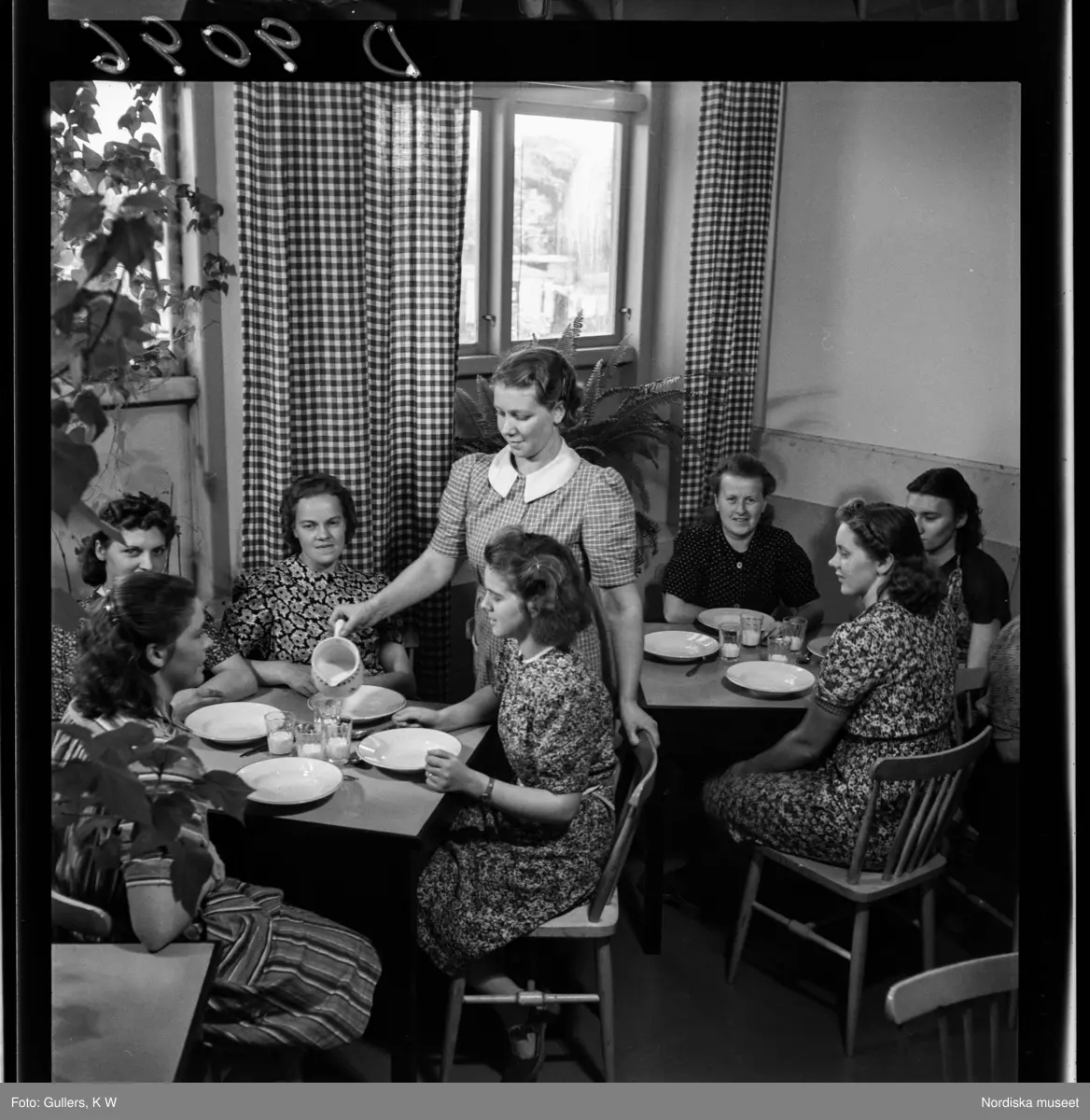 Arbete i tekoindustrin på Borås Wäfveri. Kvinnor sitter till bords i ett lunchrum.