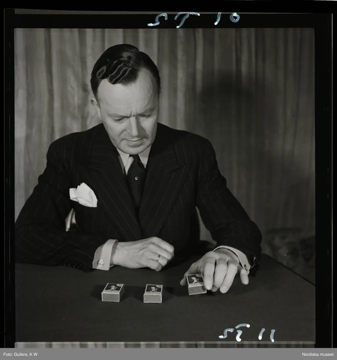 Titel: 568 Trenters reportage. En man utför trolleri-trick med tändsticksaskar.