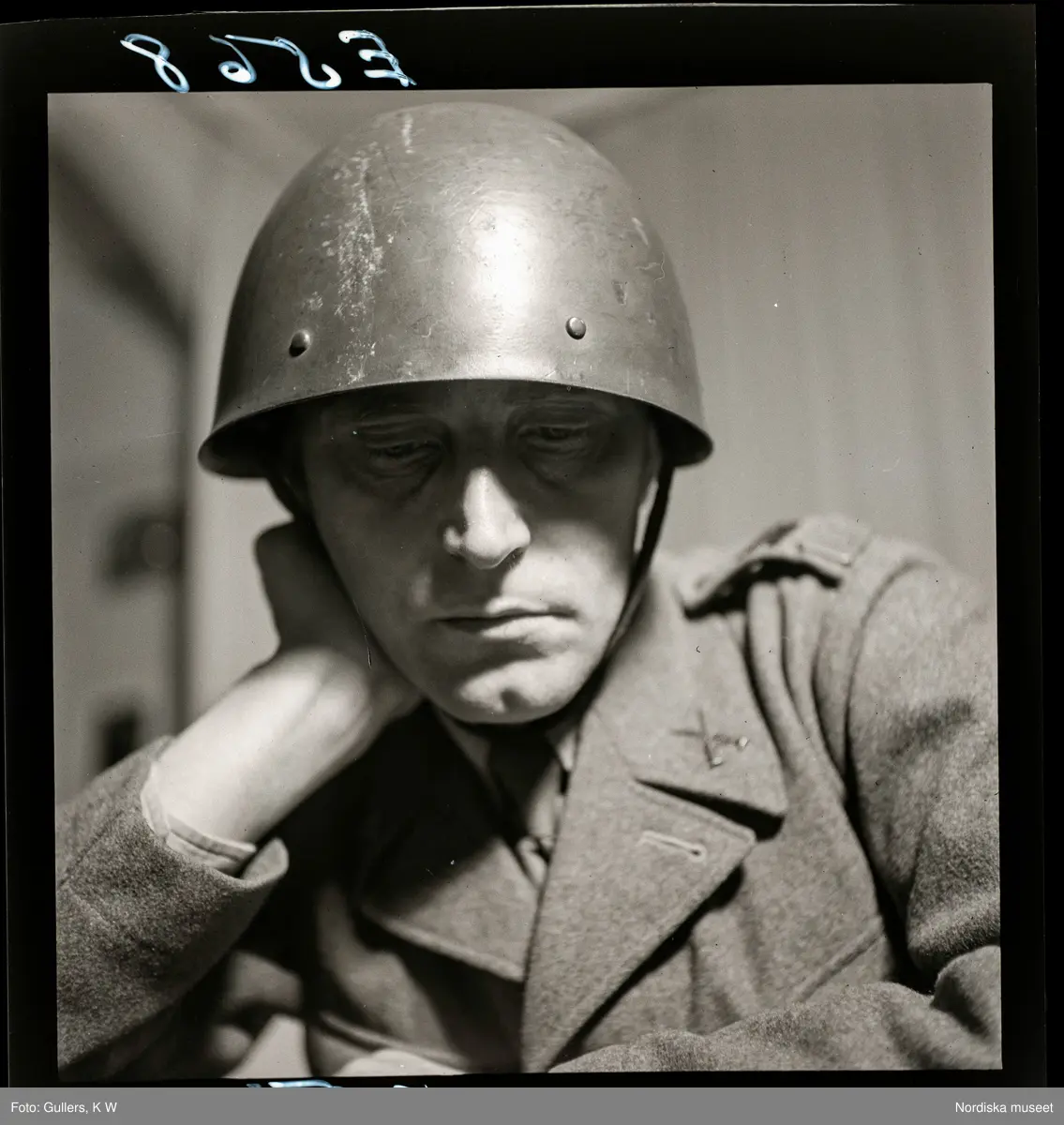 581 Bokomslag militärt. Porträtt av militär i uniform, hjälm.
