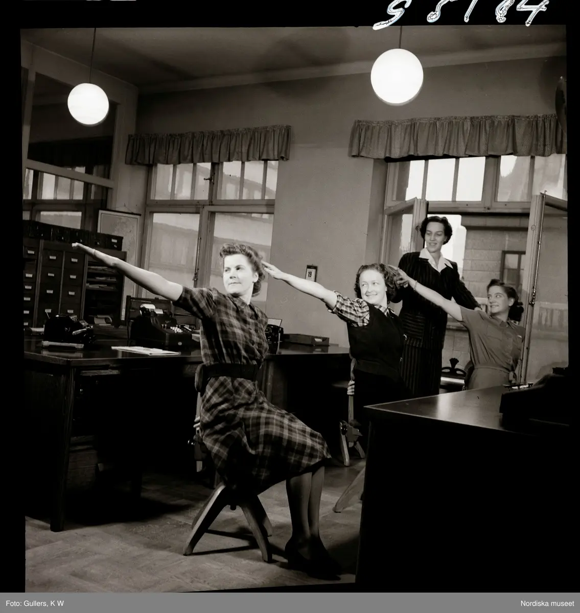 590 G, Åtvidabergs Industrier kontorsgymnastik. En grupp anställda gymnastiserar på ett kontor.