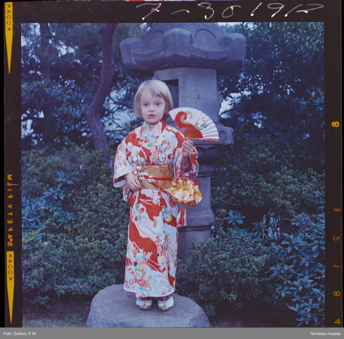 585/8 Facit Tokyo Daberg. Ett barn i kimono står i en trädgård.