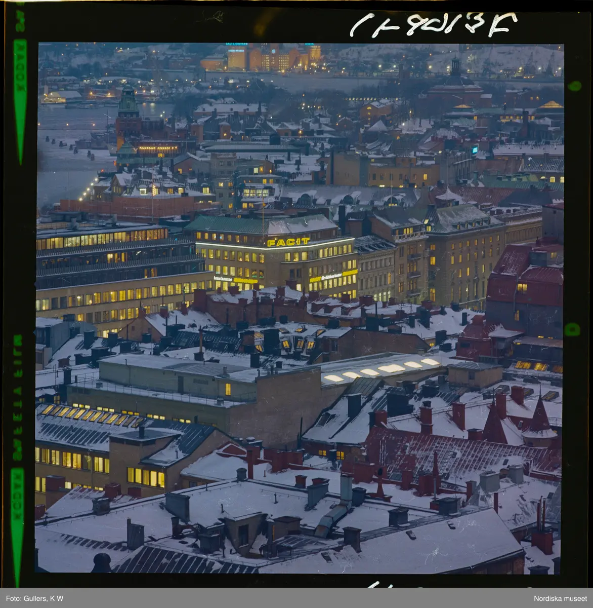585/40 Facit Nattbild från N.K + Södra Kungstornet. Kvällsbild. Facit-skylt på taket av fastigheten Styrpinnen 22, ritad av arkitekt Ivar Tengbom i hörnet Hamngatan / Kungsträdgårdsgatan i Stockholm.