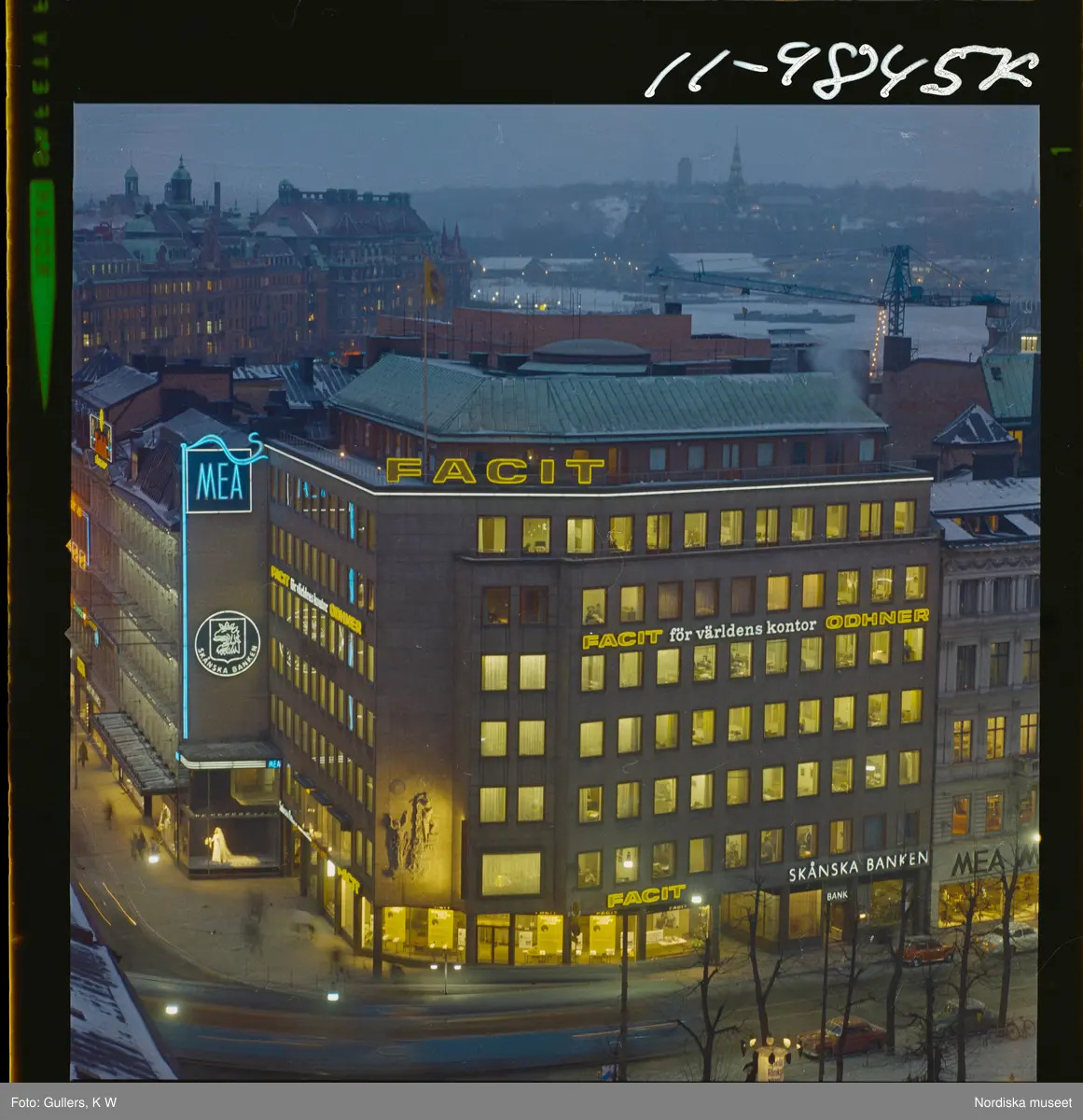 585/40 Facit Nattbild från N.K + Södra Kungstornet. Kvällsbild. Facit-skylt på taket av fastigheten Styrpinnen 22, ritad av arkitekt Ivar Tengbom i hörnet Hamngatan / Kungsträdgårdsgatan i Stockholm.