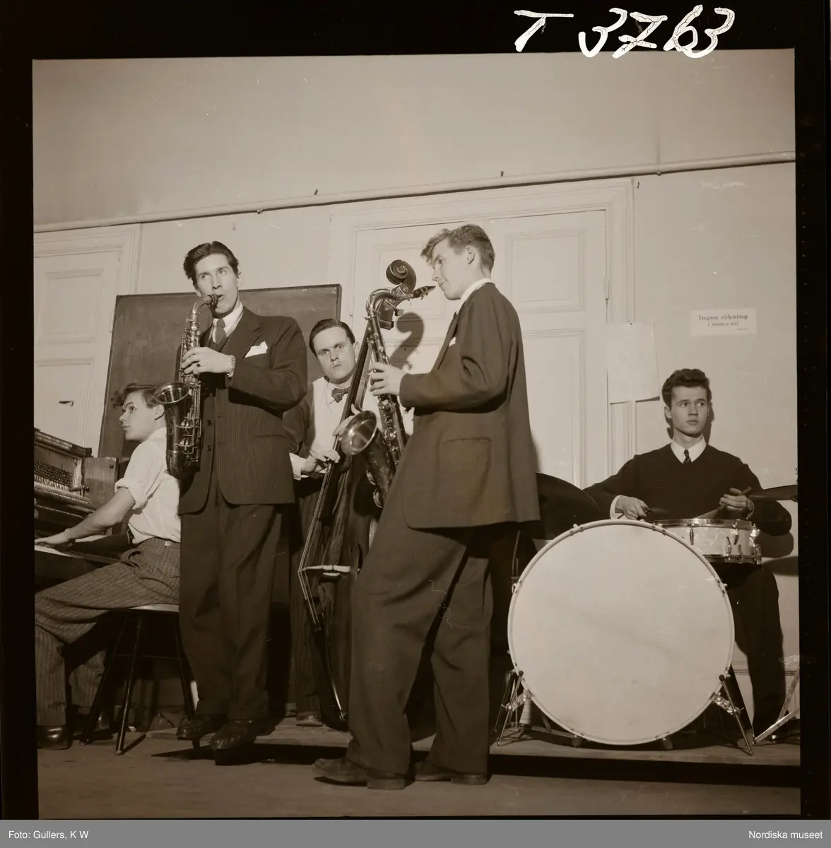 1677 B Konstfackskolan (tösen Boheman). Ett band med piano, ståbas, trummor och saxofoner spelar musik.