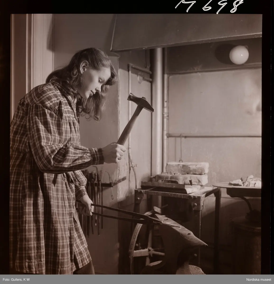 1677 Konstfackskolan. Kvinnlig elev hamrar metall.