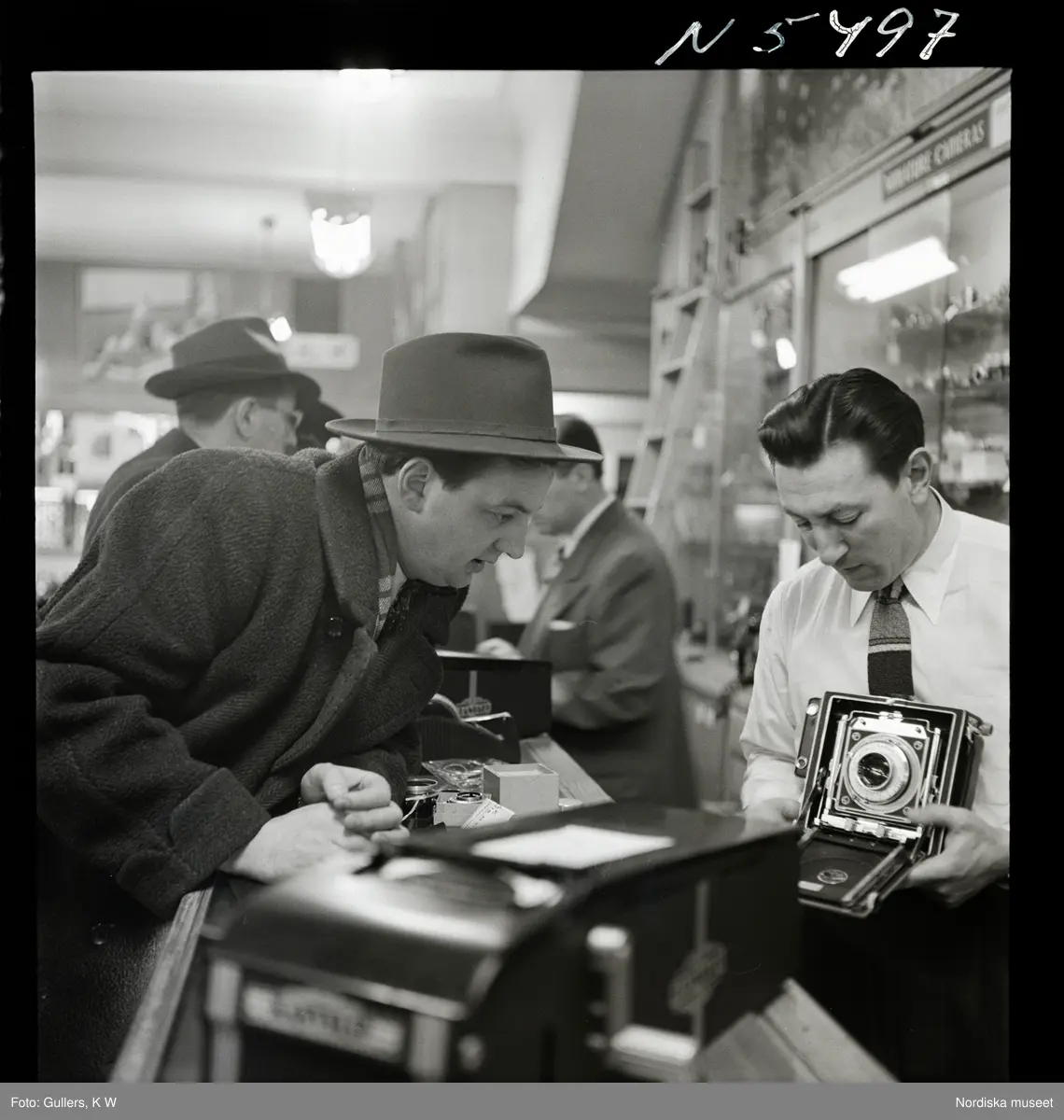 Titel: 1690 New York allmänt (N.Y. Herald Tribune). K W Gullers blir visad en kamera av en expedit i butik.