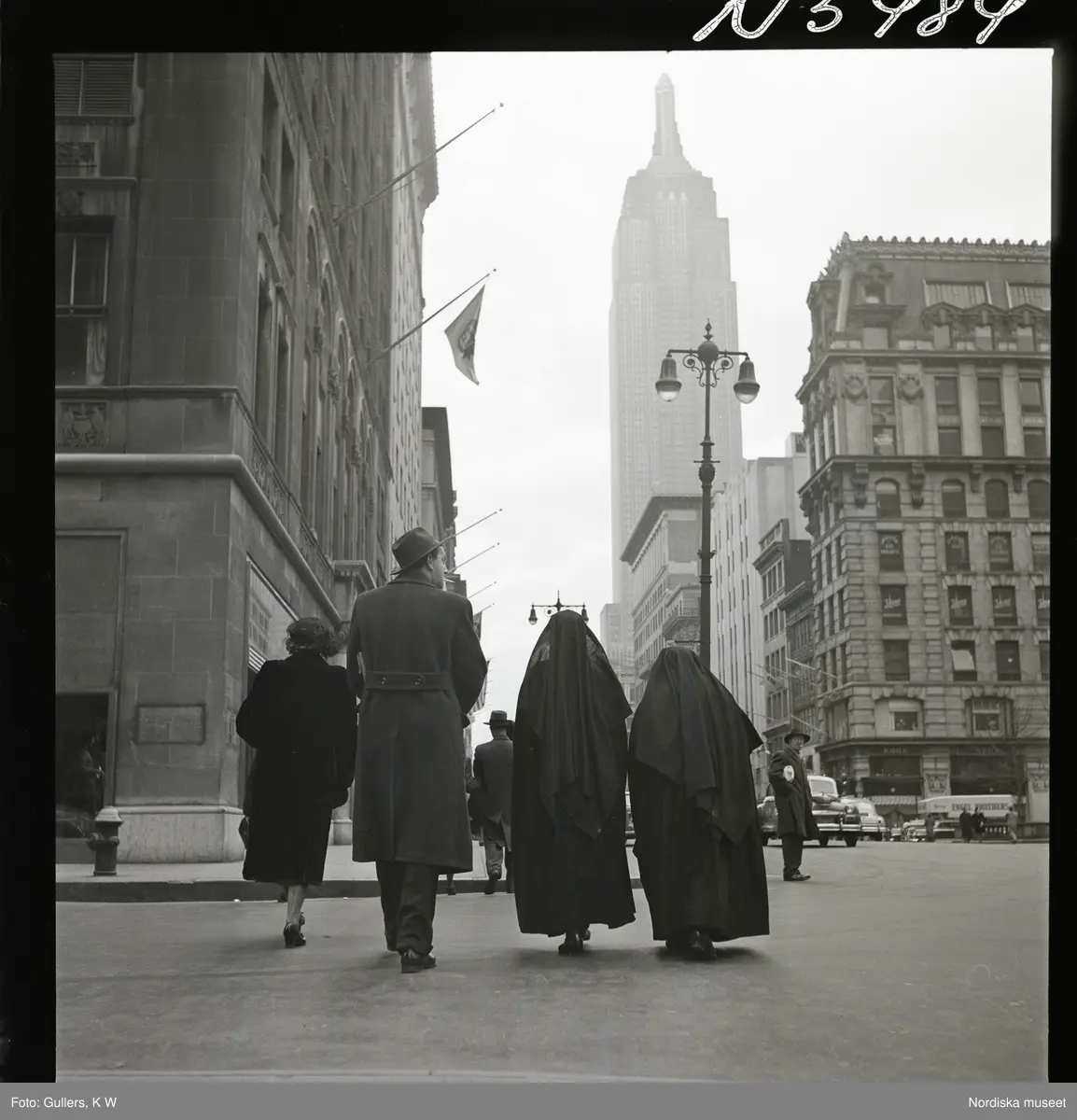1690 New York allmänt (N.Y. Herald Tribune). Nunnor passerar på trottoaren, Empire state building.