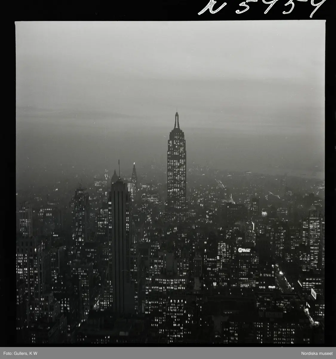 1690 New York allmänt (N.Y. Herald Tribune). Kvälls-/ nattbild. Skyskrapor.