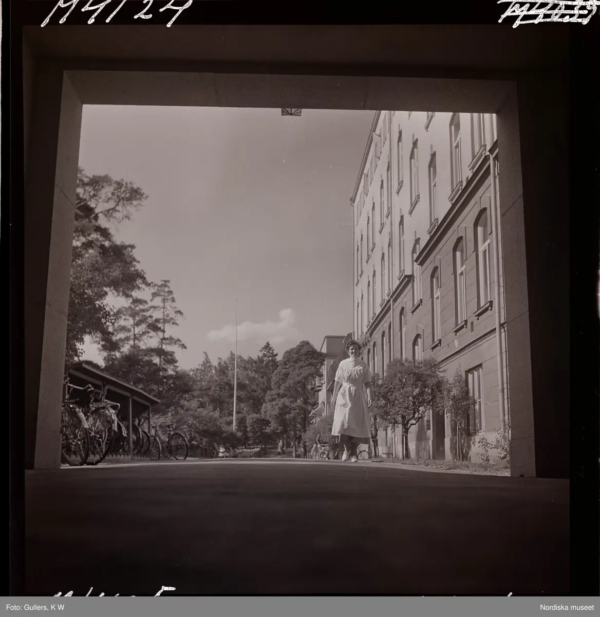 1711 En sjuksköterskas arbetsdag. En sköterska påväg in i sjukhusbyggnad.