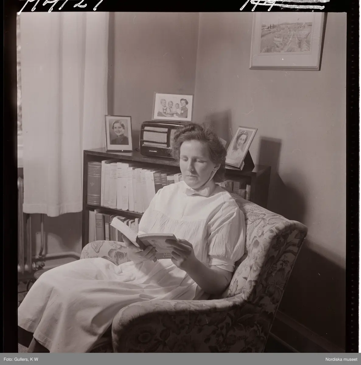 1711 En sjuksköterskas arbetsdag. En sköterska sitter och läser i en fåtölj.