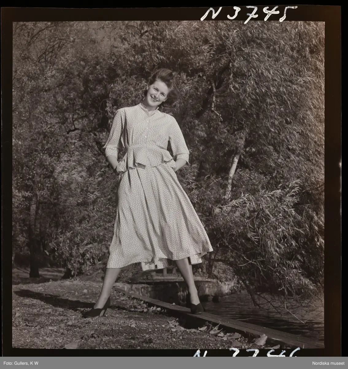 1708 N Mölnlycke väverier, mode; Stadshusträdgården, Stockholm; Mode för Mölnlycke. Modell poserar i park.