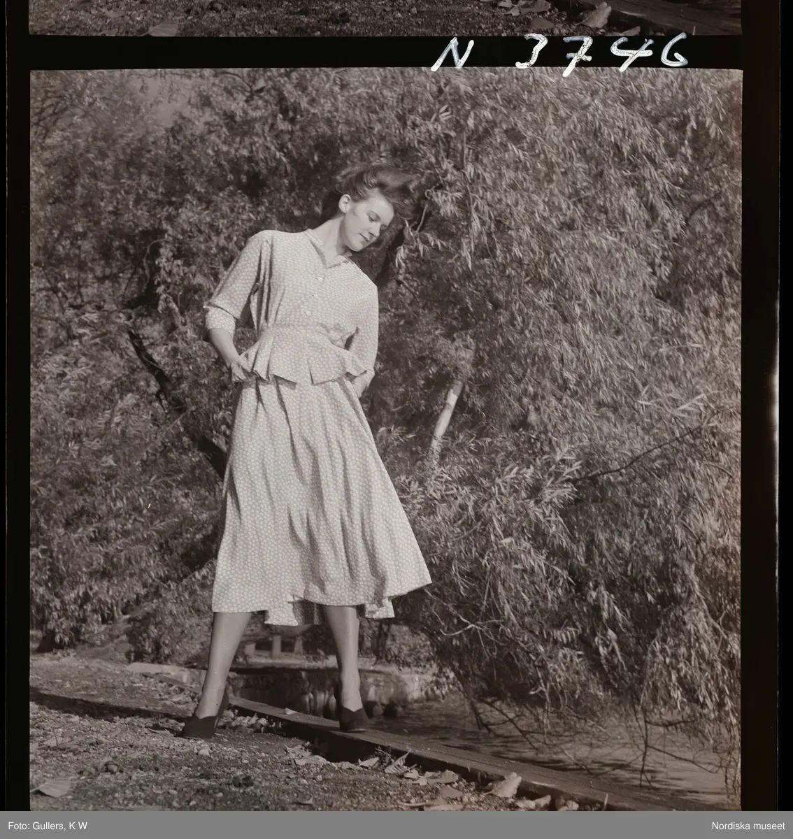 1708 N Mölnlycke väverier, mode; Stadshusträdgården, Stockholm; Mode för Mölnlycke. Modell poserar i park.