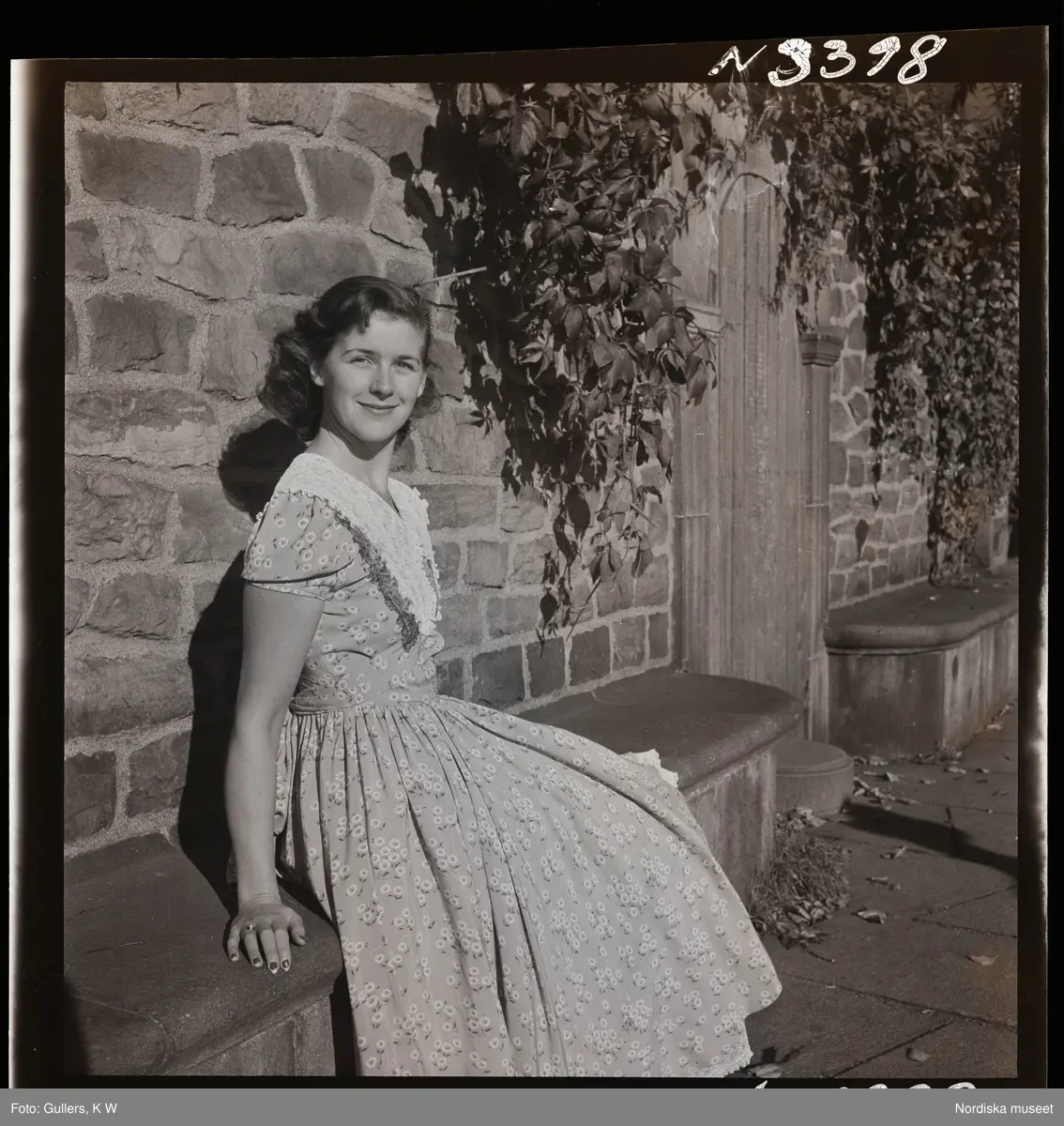 1708 N Mölnlycke väverier, mode; Stadshusträdgården, Stockholm; Mode för Mölnlycke. Modell i blommig klänning poserar på stenbänk.