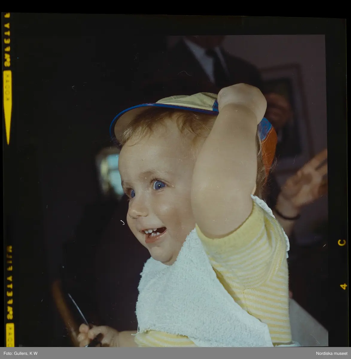 1708/R Mölnlycke väverier AB. Ett litet barn i keps och randig stickad tröja.