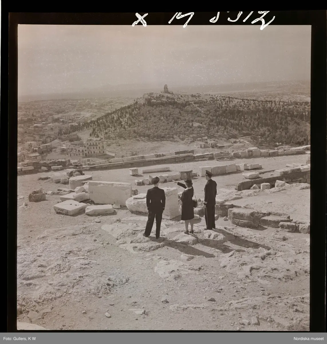 1717/H Aten. En kvinna och två män i uniform blickar ut över Aten från Akropolis.