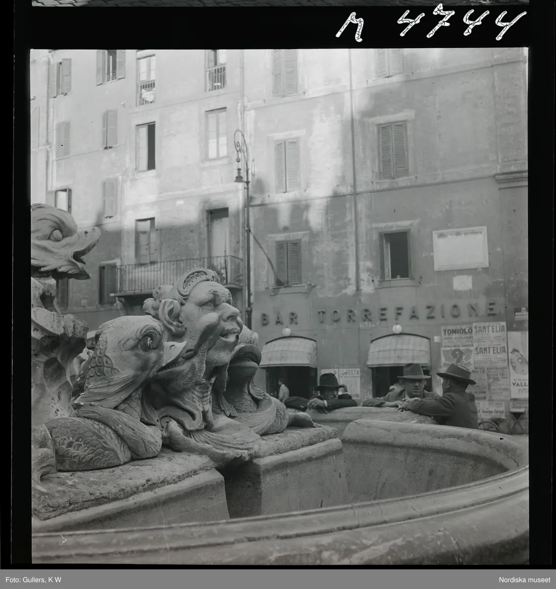 1717/A Rom. Gatuliv. Män står och pratar vid en fontän på ett torg.
