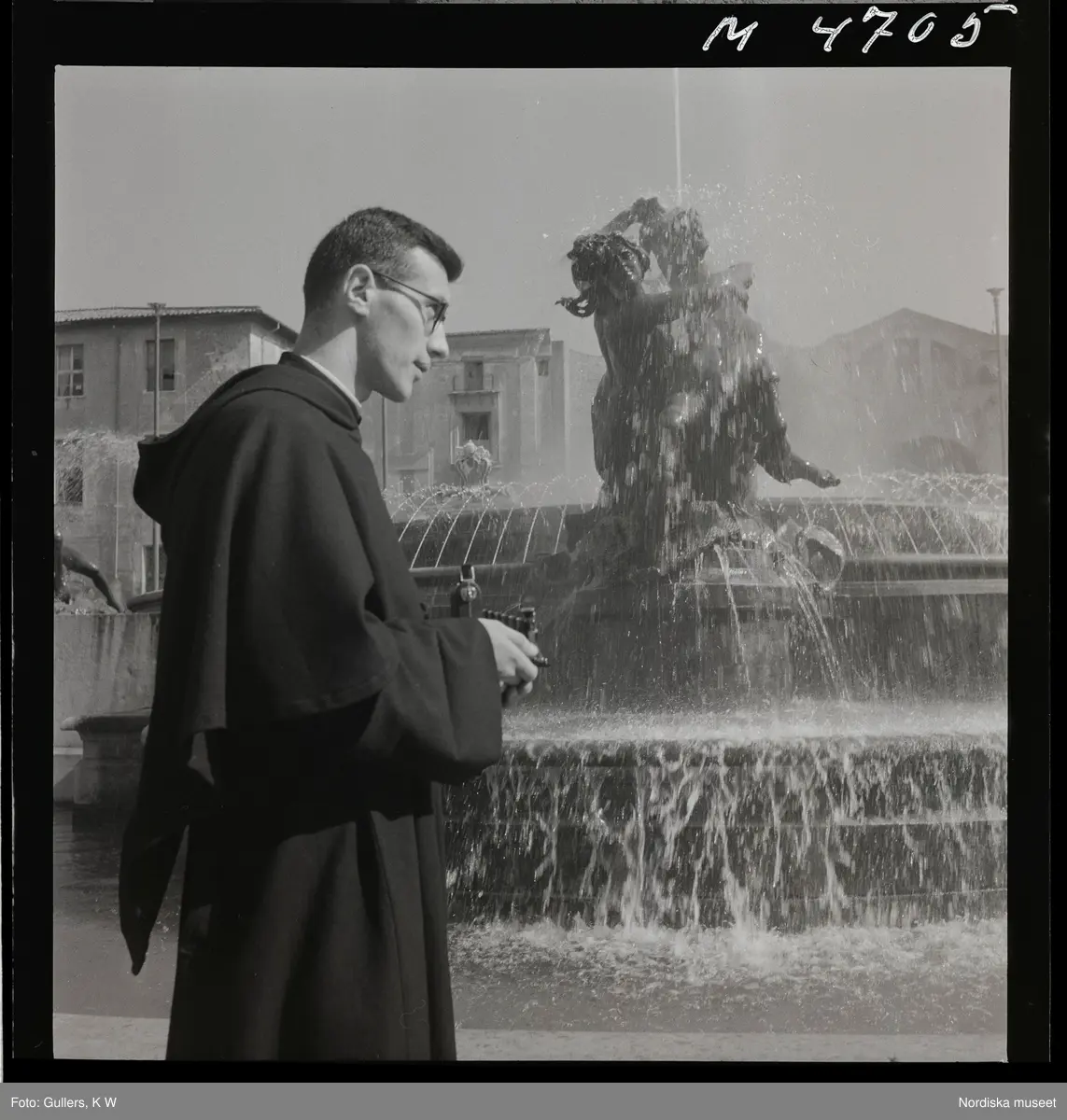 1717/B Rom. En präst fotograferar framför en fontän.