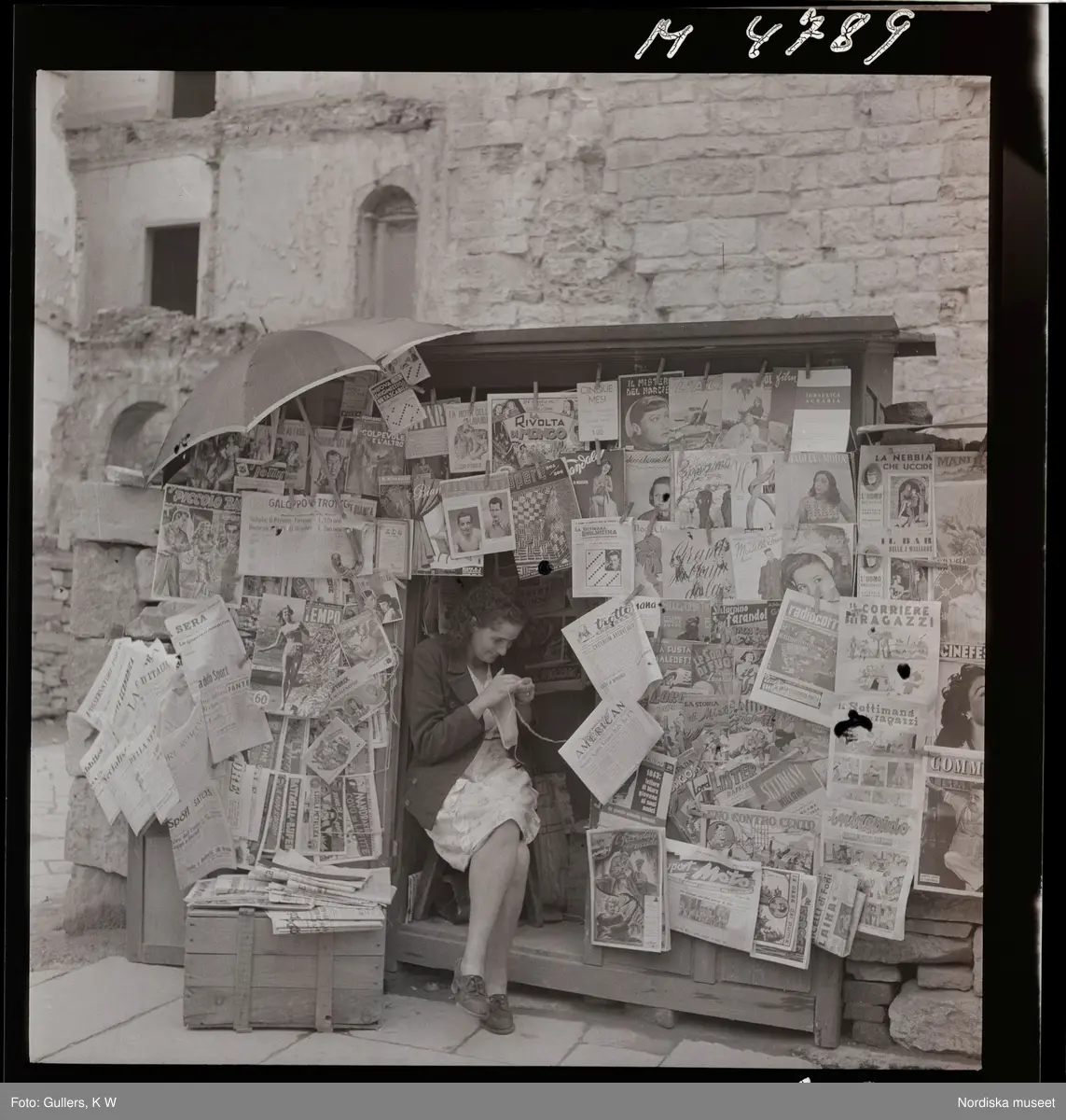 1717/B Rom. En kvinna sitter och stickar i väntan på kunder i en tidningskiosk.