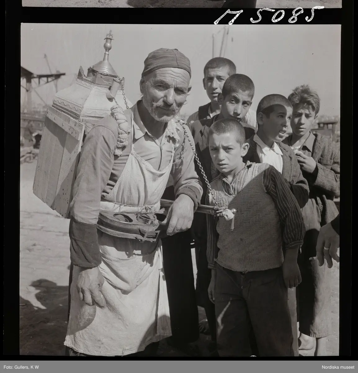 Istanbul. En gatuförsäljare som bär en samovar på ryggen, nyfikna barn intill.